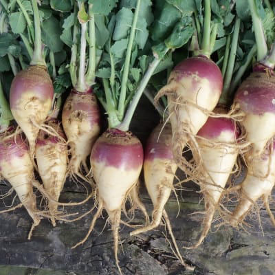 Brassica napus × Brassica rapa (pekinensis group) (95 days) Open pollinated. A cross between Chinese cabbage and rutabaga, has very fine-grained tasty yellow flesh. Exterior much like purple-crowned Laurentian rutabaga.
