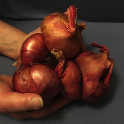 Allium cepa (aggregatum group) (105 days) Open pollinated. Handsome golden-bronze 1¼–2" bulbs uniformly divide into triples and quadruples, store into the spring, and have a luxurious caramel flavor.