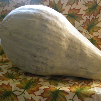 Cucurbita maxima (100 days) Open pollinated. Heirloom banana-type. Slate-blue obpyriform 6-8+ lb fruit. Average 12" long. Excellent flavor and good storage.