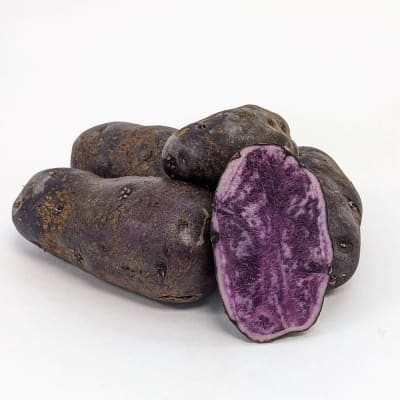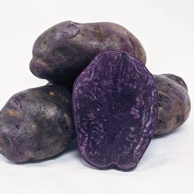 Solanum tuberosum Mid-season, blue skin, blue flesh. Maintains its purple color after boiling, roasting or frying. This spud is packed with powerful antioxidants.
