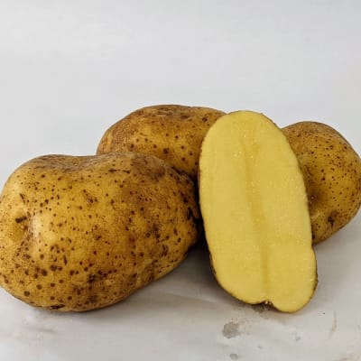 Solanum tuberosum Late season, lightly russeted yellow skin, yellow flesh. These buttery tubers are hands-down the best-tasting roasting potato in the winter. High yields, good storage qualities.